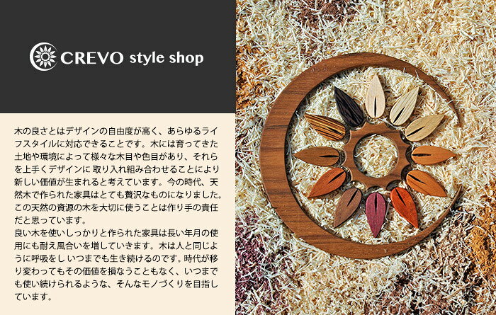 それぞれ同じ天然木であっても、 育つ環境によって木目や木肌もちがっています、その一つ一つの天然木の特徴を生かしたデザイン・デザイナーズ家具を こころがけています、各々の持つ天然木の個性あるCREVOstyleのインテリア・家具・雑貨を手にとって頂けたらと思います。