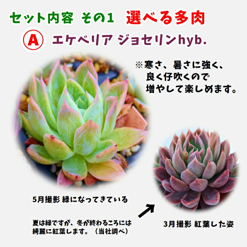 多肉初心者さんのための 多肉寄せ植えセット 商品詳細 ■商品番号 ag_set03 ■セット内容 1.選べる多肉 いずれか 1株 2.グラプトペタルム ブロンズ姫 1株 3.グラプトペタルム 秋麗 1株 4.寄せ植えに使う多肉 3種類 5.2号ポット 1個 6.多肉用の土 7.品種名(苗にお付けいたします) 8.育て方ガイド ■苗の状態 抜き苗、カット苗 ■発送方法 無料の発送方法は、『定形外郵便物』での発送となります。