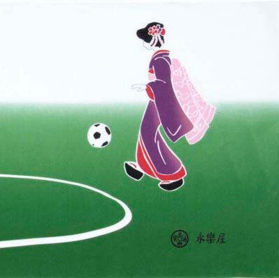舞妓さんたちが楽しそうにサッカーに興じている一場面、ユニークなデザインです。
