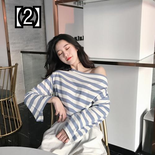 オフショルダー トップス レディース 春夏 tシャツ 長袖 ワンショルダー ボーダー 袖 スリット ゆったり 韓国 おしゃれ かわいい 青 白 黒 【1】黒いバー×S 【2】青いバー×S 【1】黒いバー×M 【2】青いバー×M