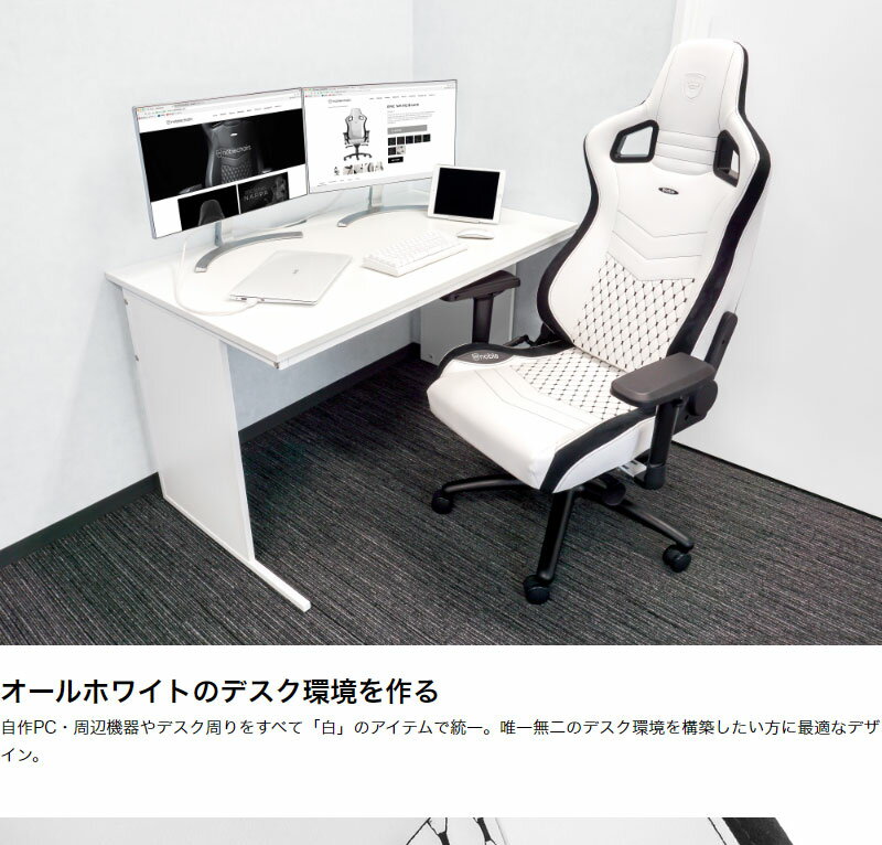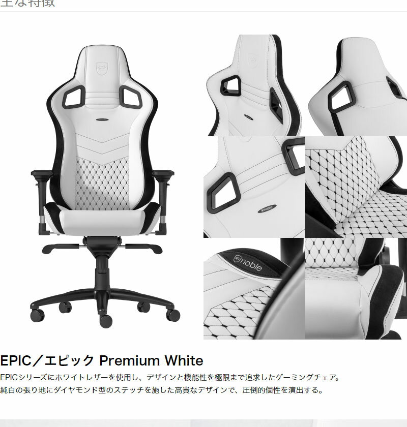 ・「noblechairs EPIC」は、1.5mm極厚PUレザー・55kg/m3高密度モールドウレタンを使用した高品質ゲーミングチェアです。