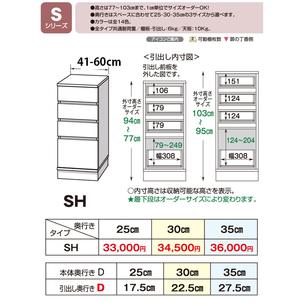 サイズ幅41〜60×奥行25×高さ77-103cm 耐荷重棚板、引き出し耐荷重6kg天板耐荷重10kgカラーカラーオーダー(全14色): ホワイト(艶有り) W、レッド(艶有り) R、モードグレイ(艶なし) MG、ブラック(艶有り) B、モードブラック(艶なし) MB、マットホワイト(艶なし) MW、ホワイトシカモア木目(艶消) WS、ライトアッシュ木目(艶消し) LA、リトモナチュラル RN、ミディアムオーク木目(艶消し) M、グレイウォルナット木目(艶消し) GR、セピアウォルナット木目(艶消し) SP、ブラックウォルナット木目(艶消)、ダークオーク木目(艶消し) DB 主な材質 耐摩耗性強化紙化粧繊維版(MDF)、ポリエステル化粧繊維板(MDF)、EBコーティング耐汚染・耐摩耗性シート化粧繊維板(MDF)(クリーンイーゴス)、プリントコート紙化粧繊維板(MDF)、アルミ押出材仕様 完成品 品質高い安全性のF☆