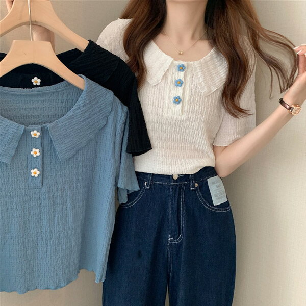 【即納あり】 フラワーボタン ブラウス 半袖 フリル襟 ショート丈 トップス シャツ 夏服 韓国ファッション 個性的 服 レトロ かわいい ダンス 衣装 コスチューム