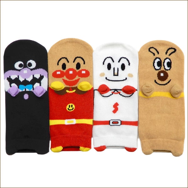 ※程よい厚さの生地で、履き心地・肌触り◎!履育にぴったり!履くだけではなく手にはめてパペット遊びもできて楽しめます! ※アンパンマン・ばいきんまん・しょくぱんまん・めいけんチーズの可愛い4足セット。