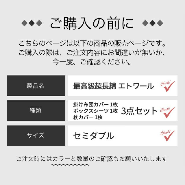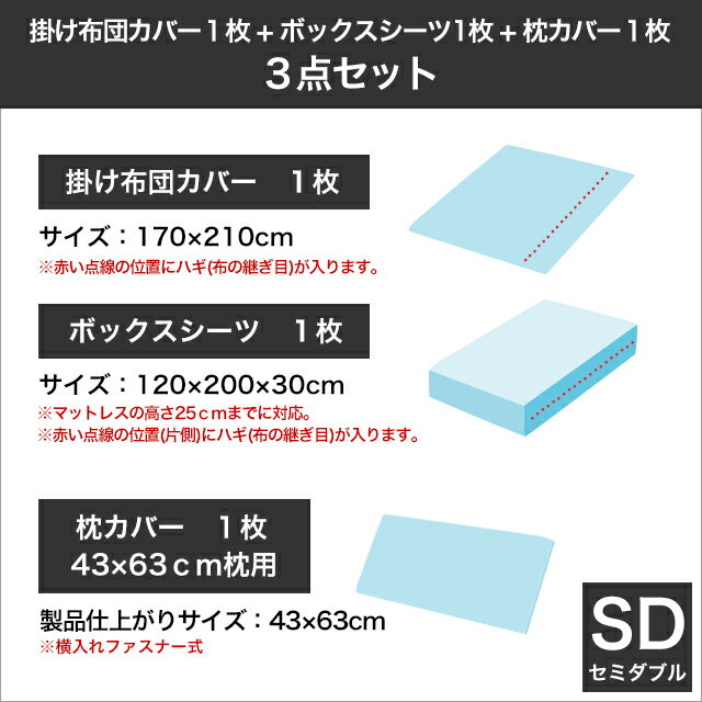 商品詳細 仕様 【ベッド用】3点セットセミダブル用 ●掛け布団カバー 1枚 170X210cm (重量:約940g) 8ヶ所布団止めスナップボタン付き 横全開ファスナー 片側にハギ(布の継ぎ目)が入ります。