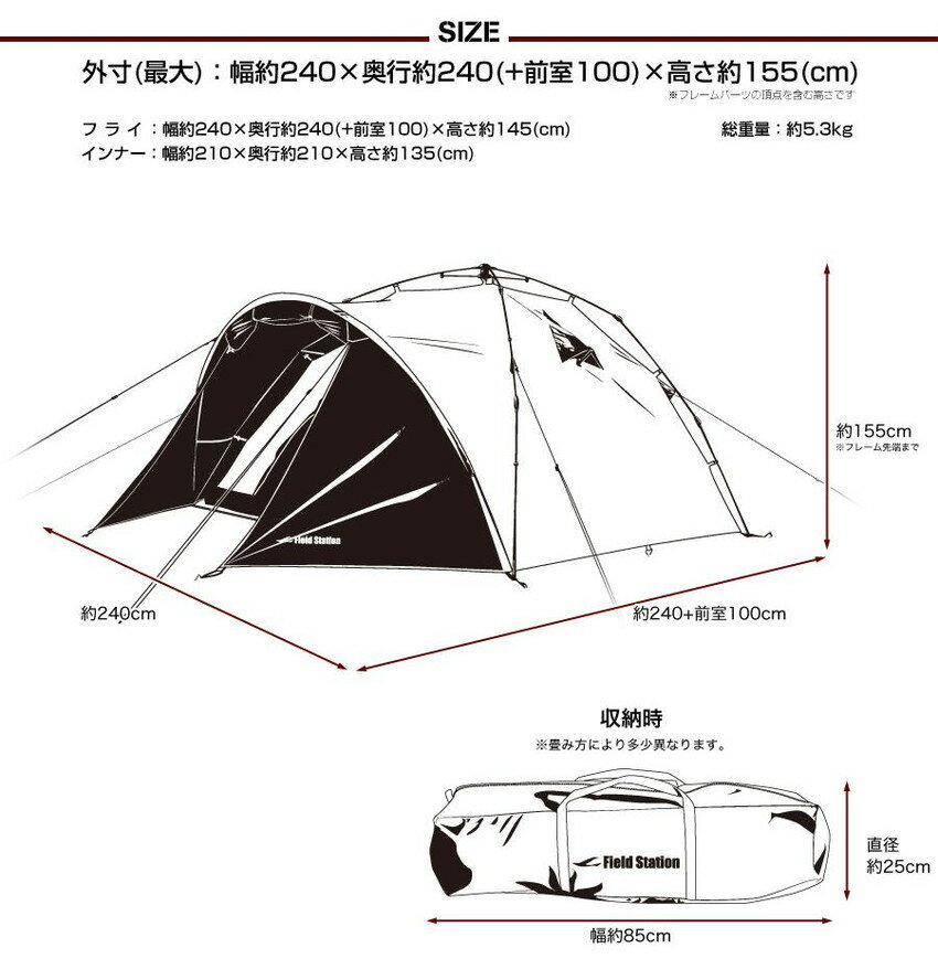 【サイズ】幅240×奥行240(+前室100)×高さ135cm(フレーム先端までは約155cm)【重量(kg)】5.3【素材・材質】ポリエステル、グラウファイバー【原産国】中国【代引きについて】こちらの商品は、代引きでの出荷は受け付けておりません。